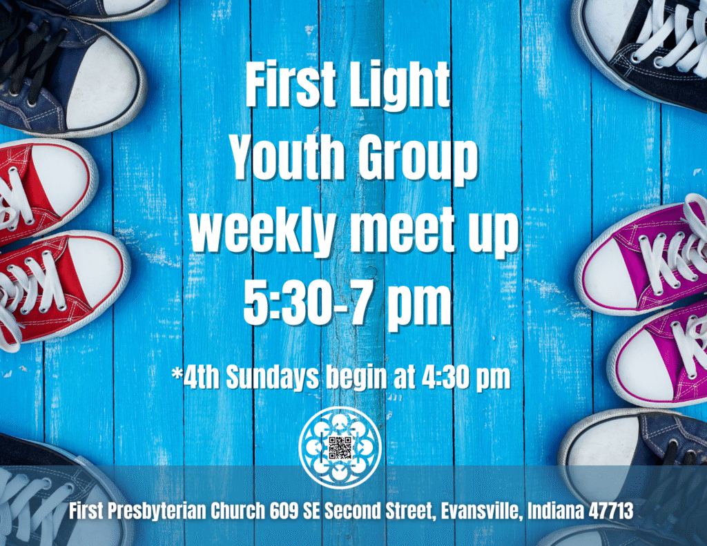 First Light Youth Group meets on Sunday nights from 5:30 – 7:00 p.m. for students from 6th to 12th grade. Most meetings are held in the youth rooms at the end of the hall in the education wing of First Presbyterian Church. Occasionally, gatherings are held in alternate locations for outdoor activities.